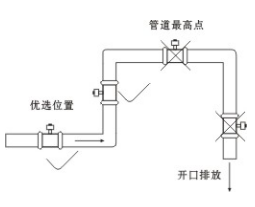 (4)流量計安裝位置介質(zhì)不滿時,可采取抬高流量計后端管路的方法,使其滿管,嚴禁在管道最高點和出水口安裝流量計。