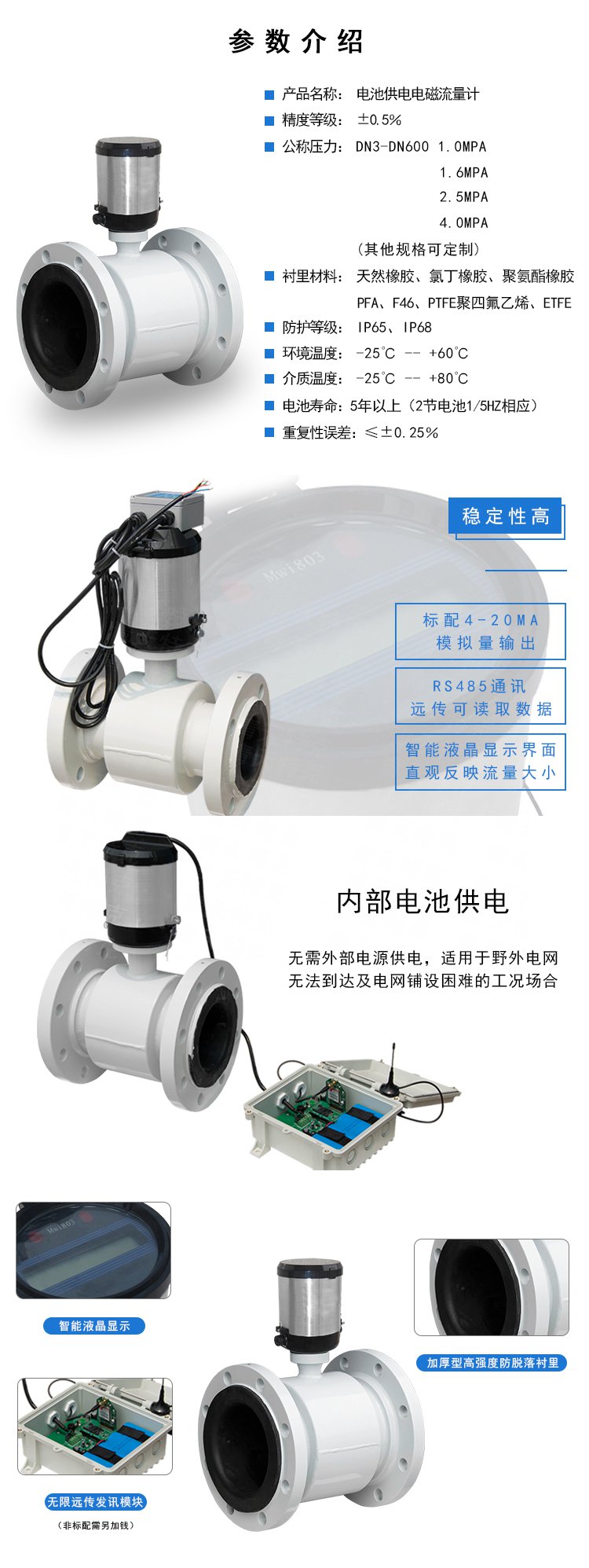 電池供電電磁流量計由電磁流量轉換器和電磁流量傳感器兩部分組成。